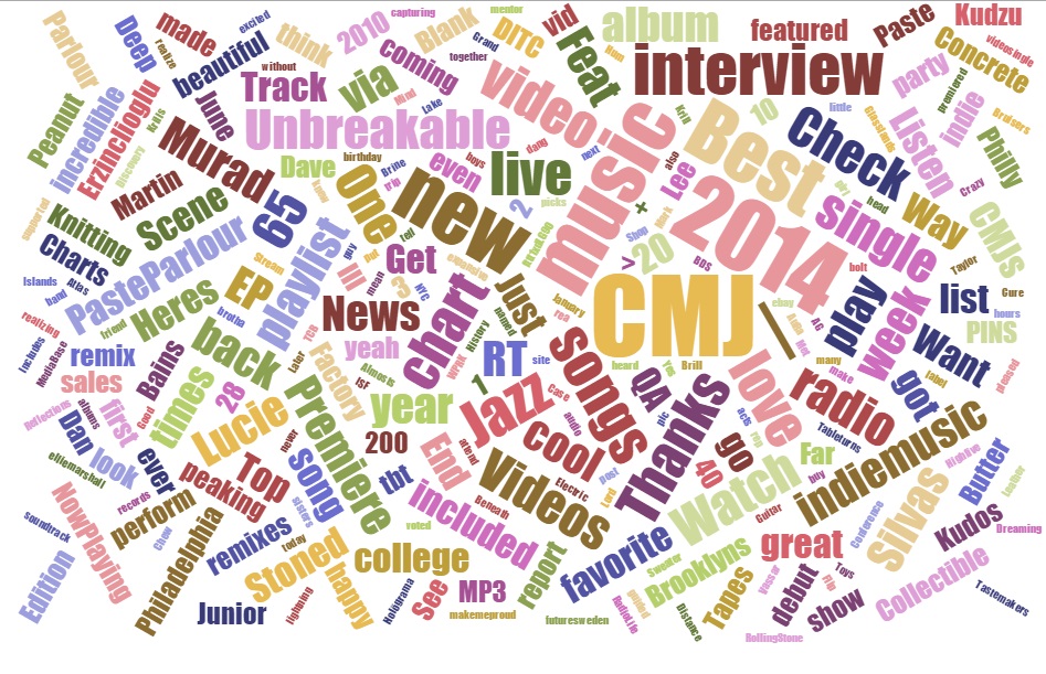 In the CMJ cloud, the words which stood out to me include “new,” “songs,” “Jazz,” “Videos,” “news,” “one,” “unbreakable,” “interview,” “best,” “premiere,” “Murad,” and “Lucie.” How relevant are these words to what people have tweeted about CMJ in the last few weeks? Here is what I observed: