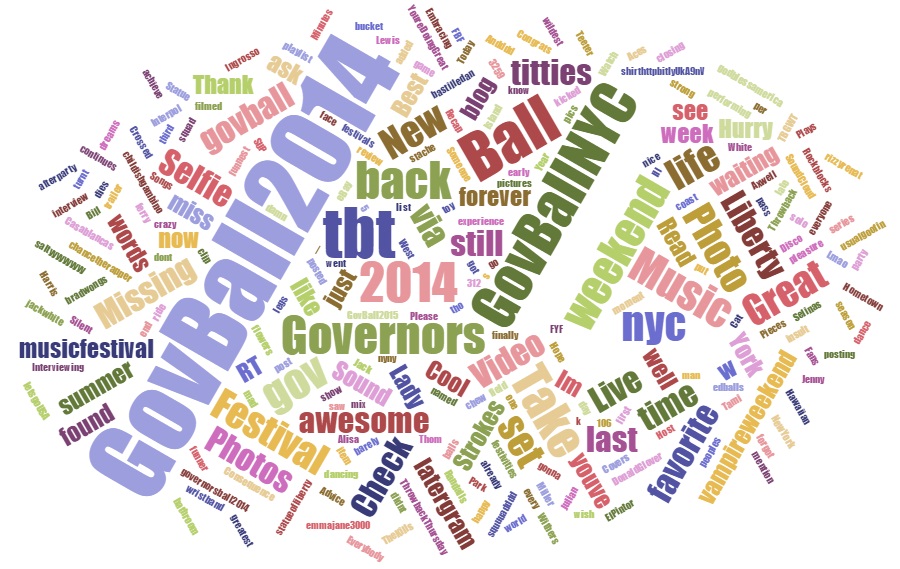 “Tbt” appears in this word cloud as one of the largest after GovBall2014. Those of you Twitter fans know it stands for “Throw Back Thursday.” Naturally, one can assume that many remember the 2014 Governors Ball Music Weekend in the final weeks of December. As for musical acts that appear in the cloud, it appears that the Strokes and Vampire Weekend show up on most these Tweeters’ minds as December comes to a close. Out of all the musical acts that the Governors’ Ball brought New Yorkers; these were the two bands which came out on top.