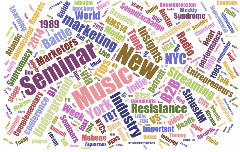 So what do I see for this word cloud? Aside from New Music Seminar, I see “marketing,” “insights”, “streaming,” “industry,” “underground,” “marketers,” “Tips,” “Tune,” and “Battle.” This last word most likely refers to the battle of the top three bands at the 2014 NMS looking to win prize money. These bands included VanLadyLove, Kiah Victoria and June Divided.